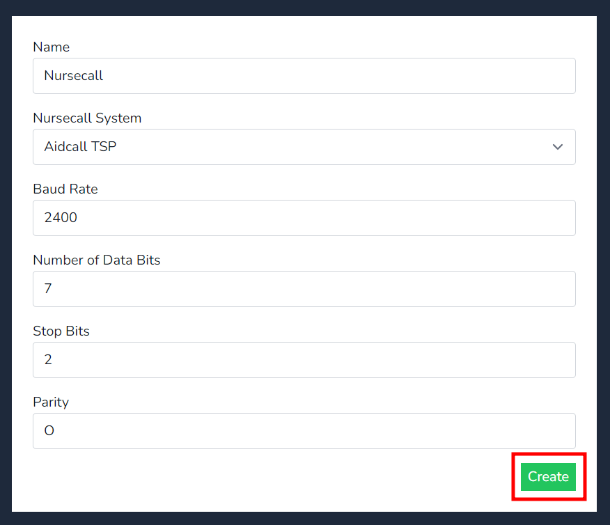 - Baud Rate Parameters: Ensure these match the settings of your Nursecall system.