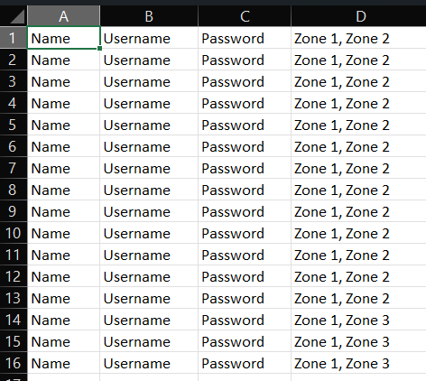 - Note: Adding zones to the CSV document will automatically create those zones within the system when uploaded.