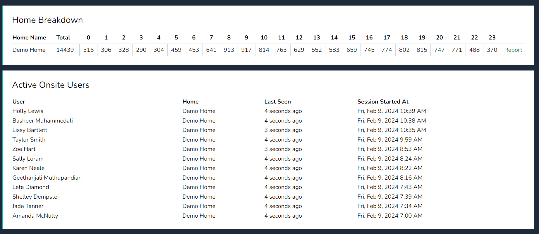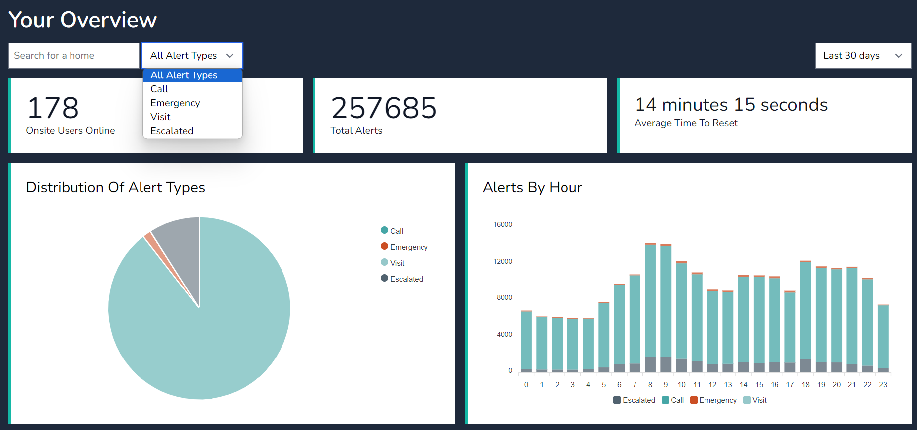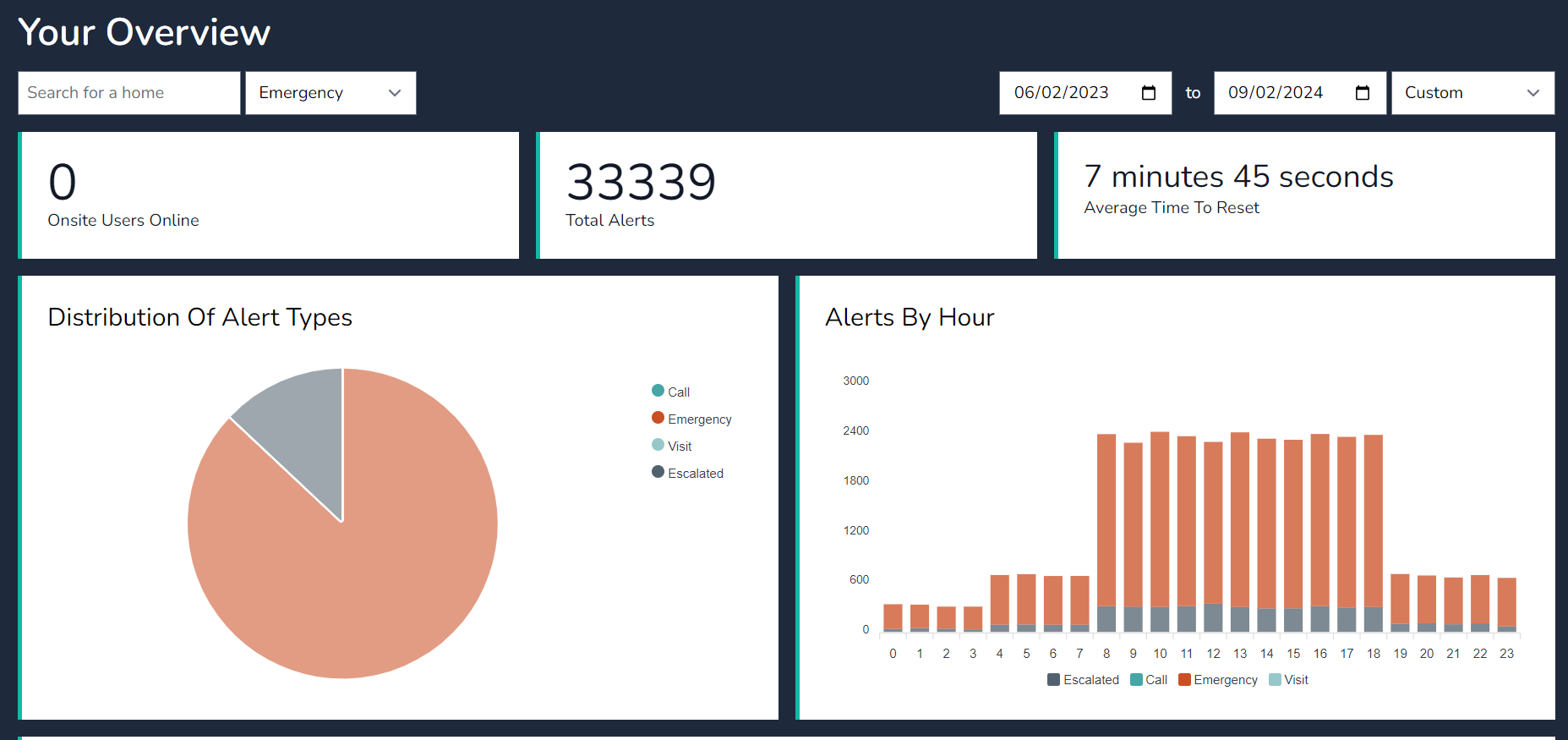 Dashboard Overview: The dashboard offers a visual snapshot of alarm management within care homes. Here are the key features: