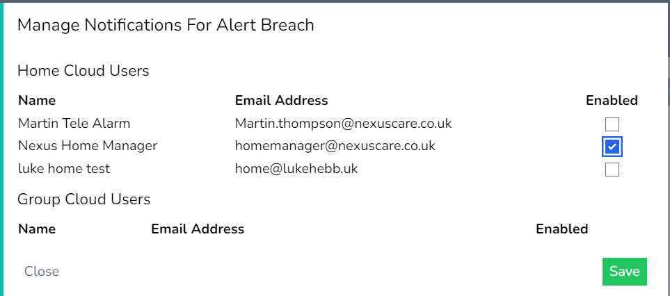 6. Notifications can be sent if a threshold has been breached and users need to be notified of the breach. Enable the user(s) for the email notification & press save