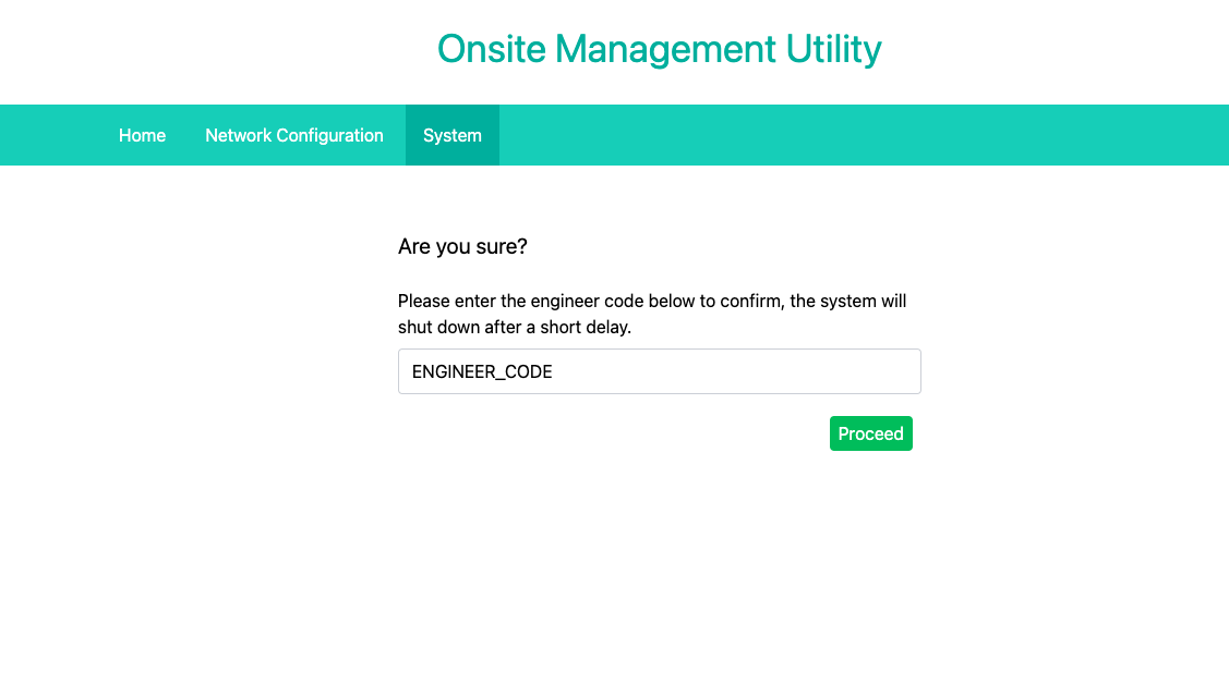 After this you will be taken to a page to confirm the action by entering the engineer code for this site. Once this is done the unit will shutdown shortly. To boot the collector back up again, disconnect and reconnect the power supply. The collector will automatically boot back up.
